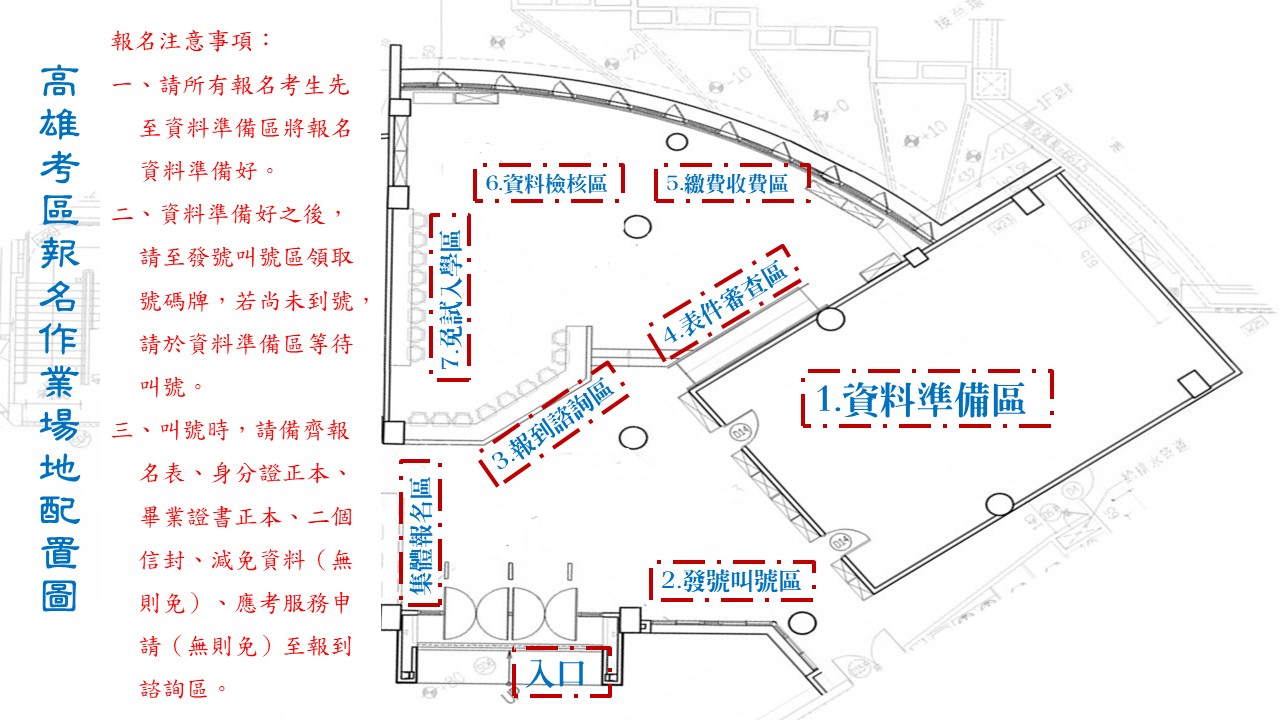 一、現場送件時間:3月5日(星期四)、3月6日(星期五)、3月7日(星期六)每日上午9:00-12:00、下午13:30-17:00。 二、地點:楠梓高中圖書館一樓(高雄市楠梓區清豐路19號) 三、須備齊報名表、身分證件正本、學歷證件正本、報名費、12K信封二個(須貼妥35元郵票)、減免文件正本(無則免)、應考服務申請表及證明文件(無則免)。 四、委託報名者,需檢附委託書(如附件檔案),當日需同時出示委託人及被委託人的身分證件正本。 五、現場送件流程、場地指引、場地配置,詳如附件。 六、如有任何問題,請逕洽報名組萬老師(07-3550571#1110)。